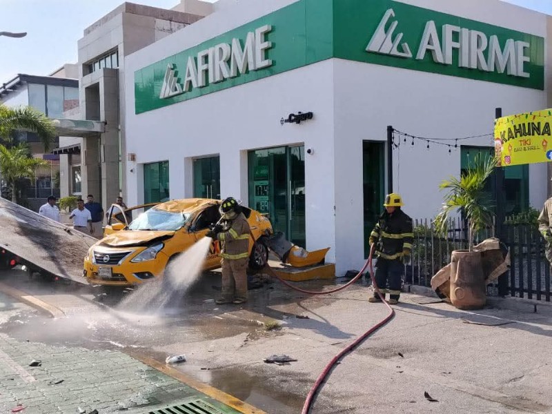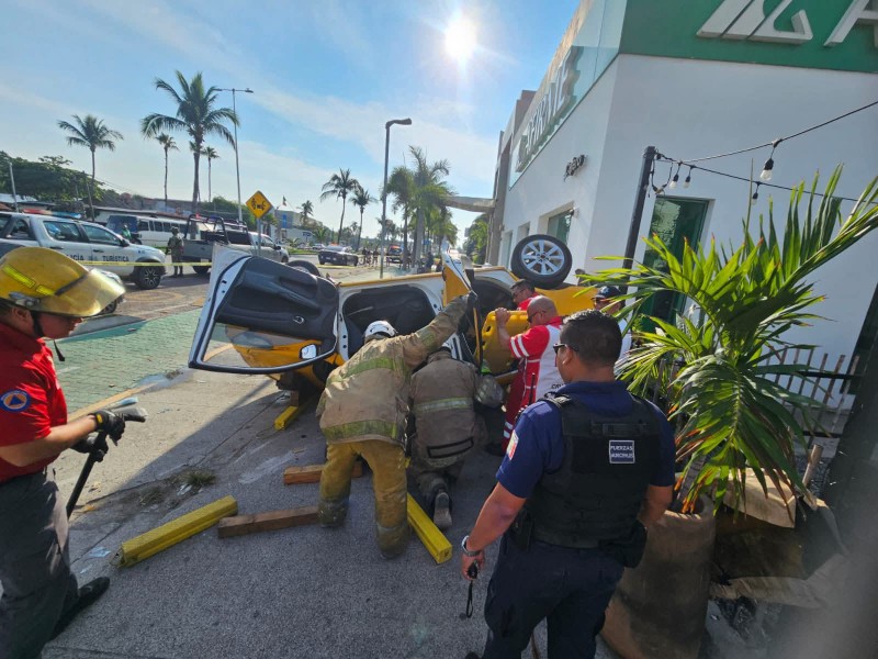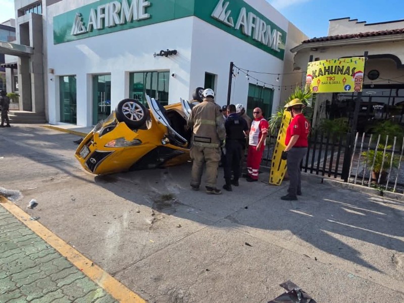 Dos personas resultaron lesionadas la mañana de este sábado al registrarse la volcadura de un taxi sobre el boulevard Miguel de la Madrid, a un costado de Punto Bahía, en la ciudad de Manzanillo.