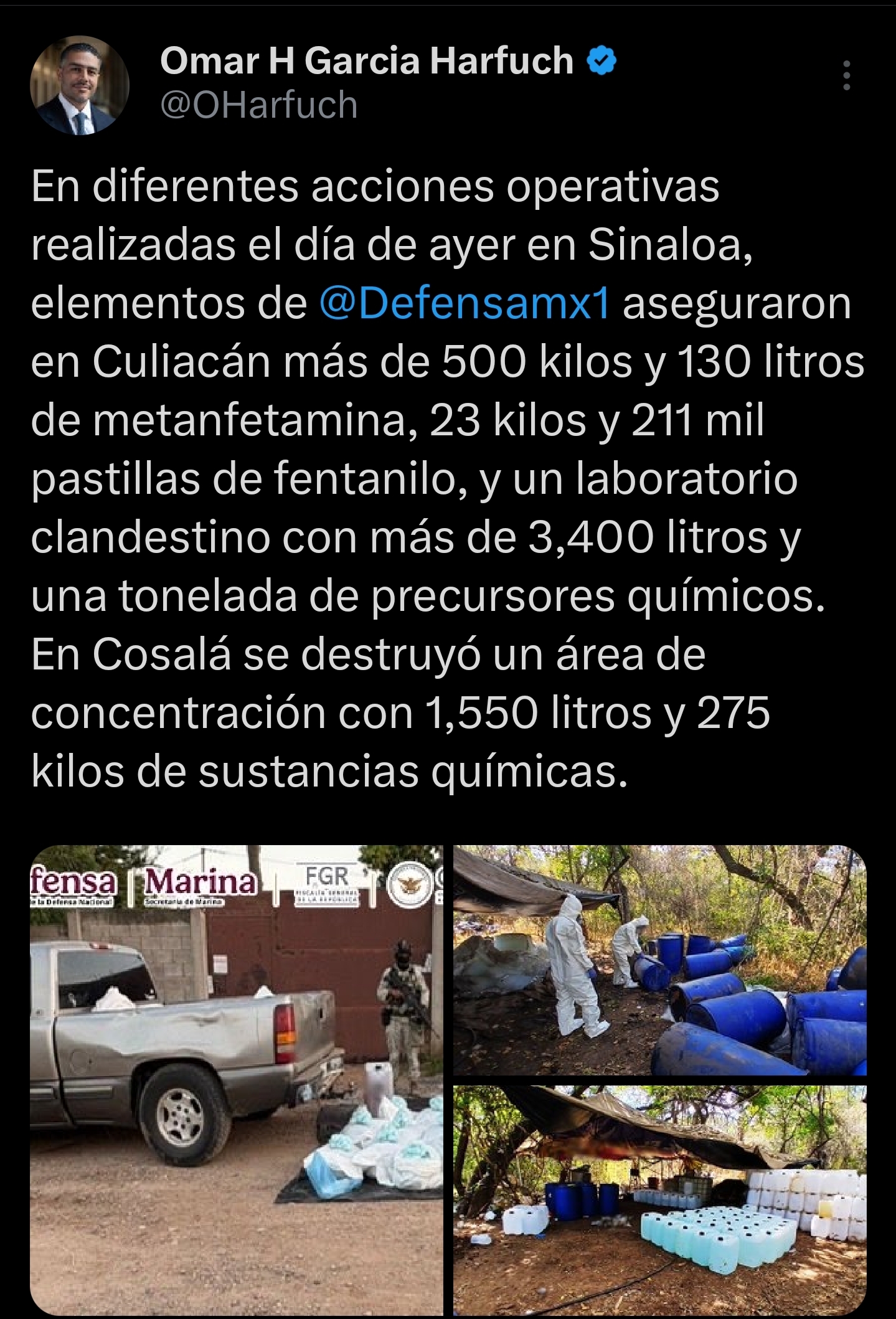Mediante redes sociales, Omar García Harfuch informó que en diferentes acciones operativas realizadas el día de ayer (lunes) en Sinaloa, elementos de la Defensa aseguraron en Culiacán drogas, un laboratorio clandestino y precursores químicos.
