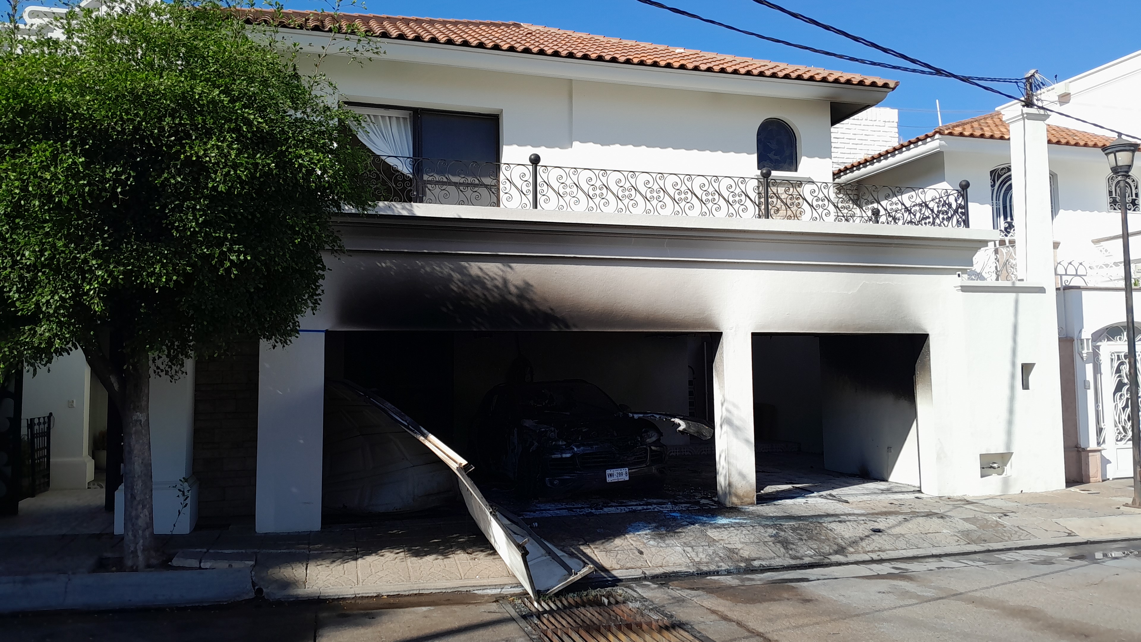 En la cochera quedó completamente quemada una camioneta Porsche de lujo de modelo reciente; checando a simple vista se podía apreciar que en la unidad se registró una explosión por los daños ocasionados al cofre del motor y el parabrisas.