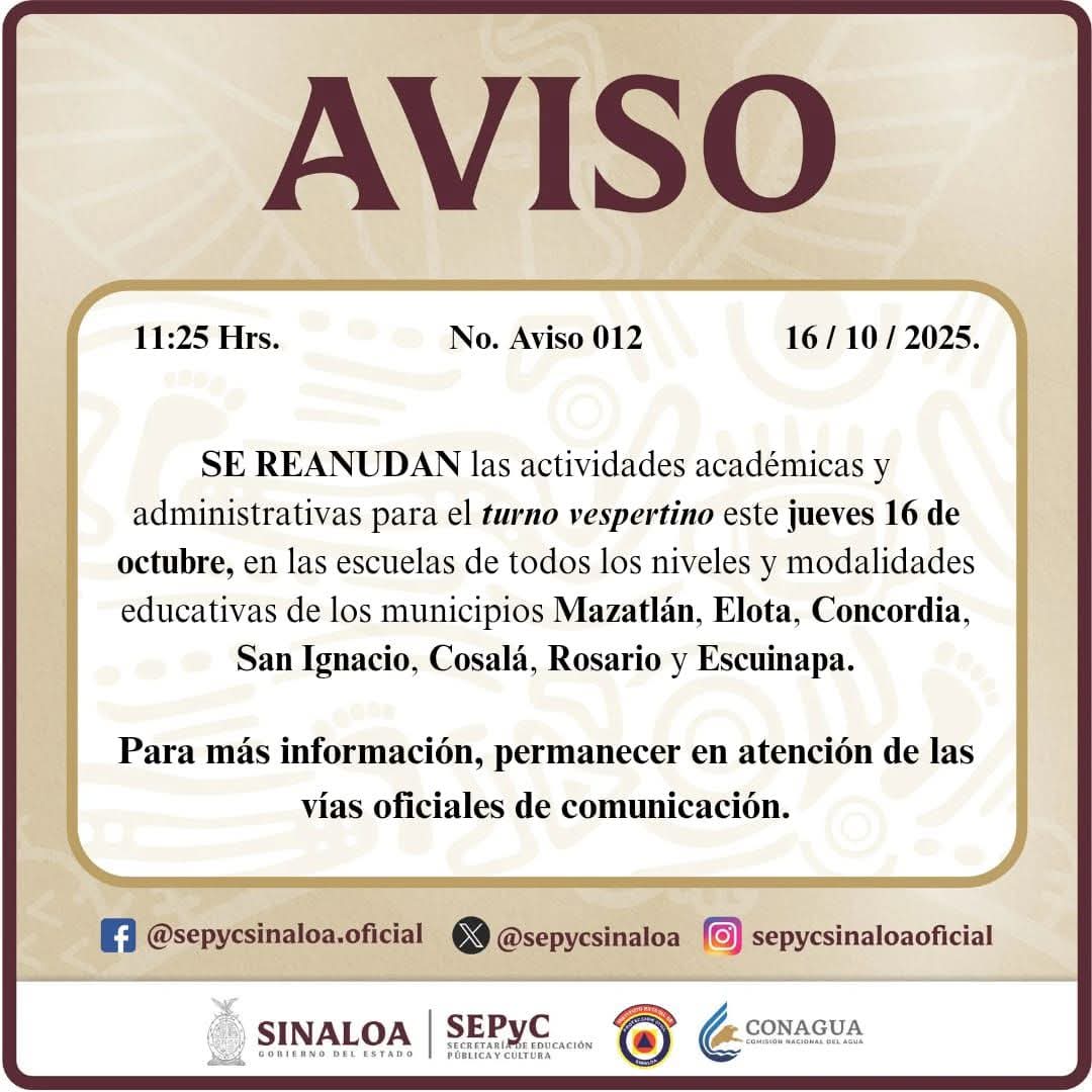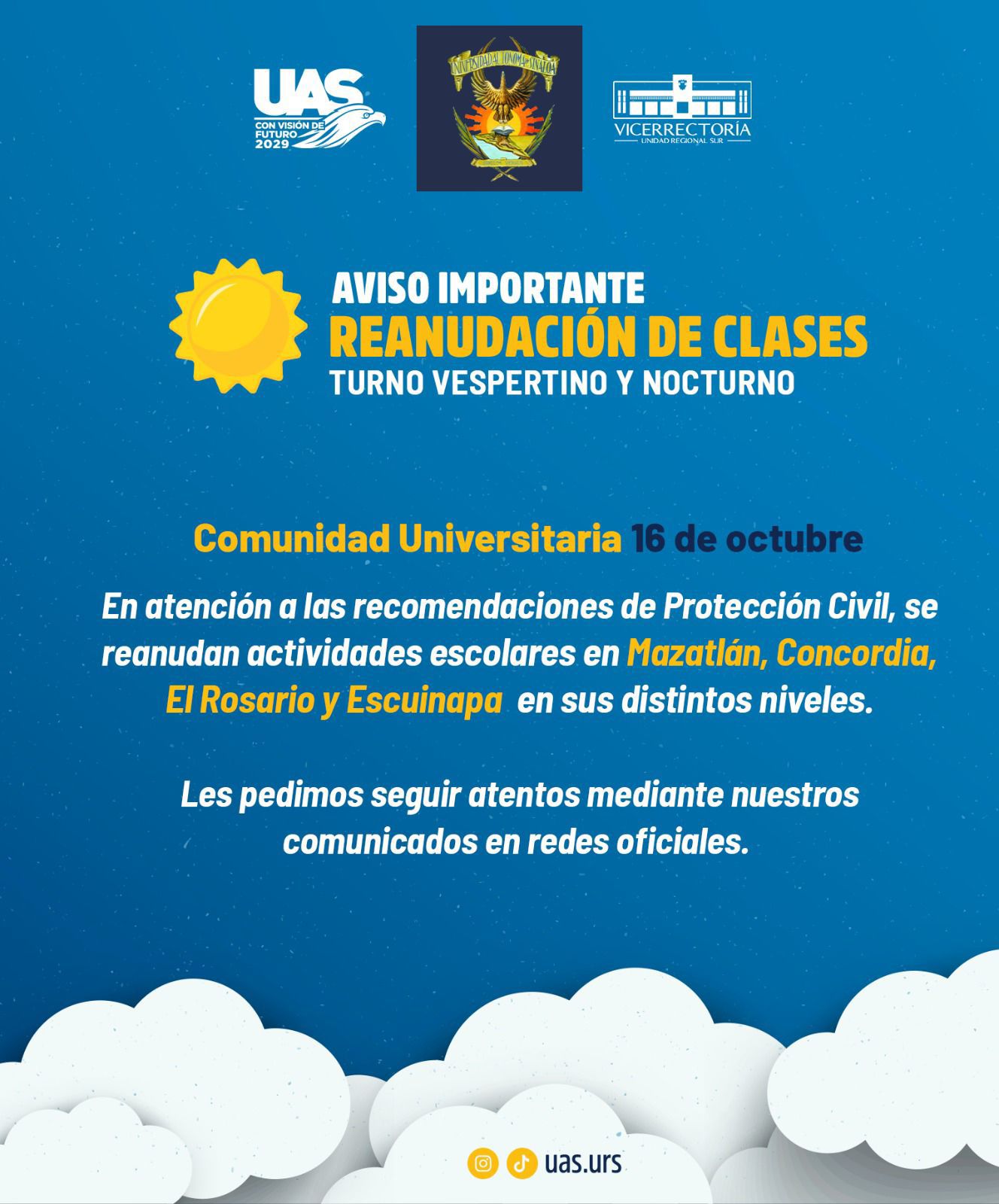 La Secretaría de Educación Pública y Cultura de Sinaloa y la Universidad Autónoma de Sinaloa han anunciado la reanudación de clases en las escuelas del sur de Sinaloa, que habían suspendido sus actividades debido a las condiciones climáticas adversas de la mañana de este jueves 16 de octubre de 2025.