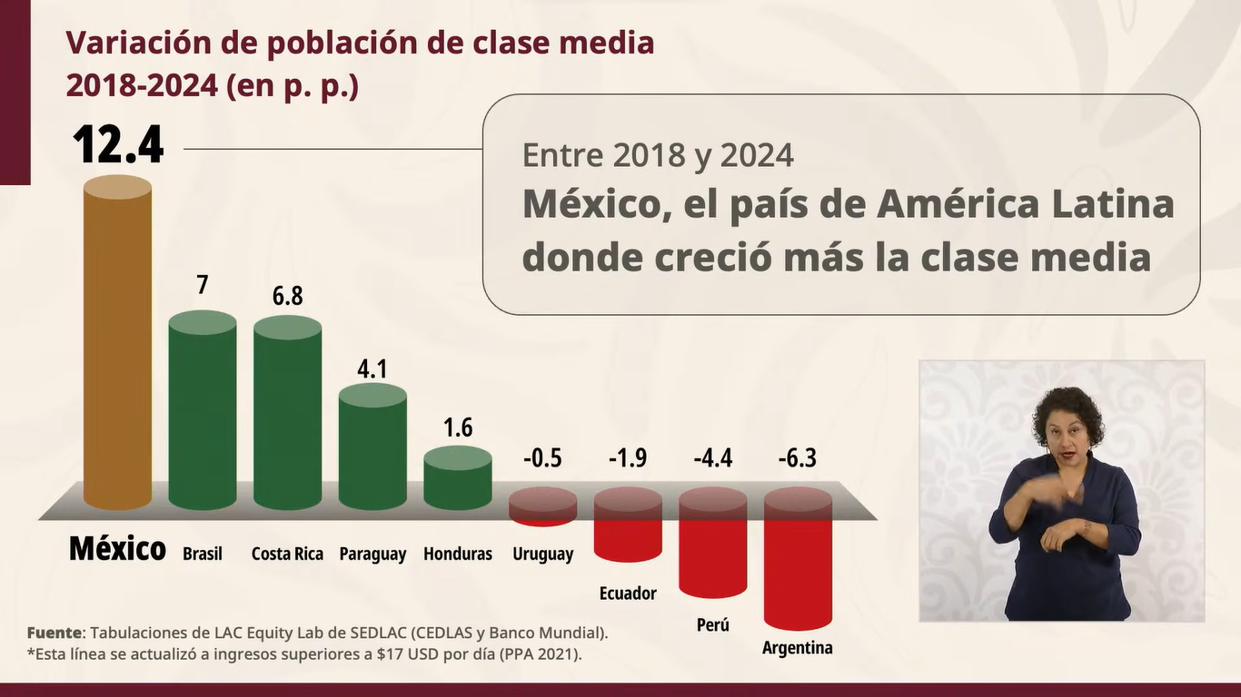 Entre 2018 y 2024, la proporción de personas que integran la clase media en México pasó del 27,2 % al 39,6 % de la población, según datos del Banco Mundial citados por el Gobierno