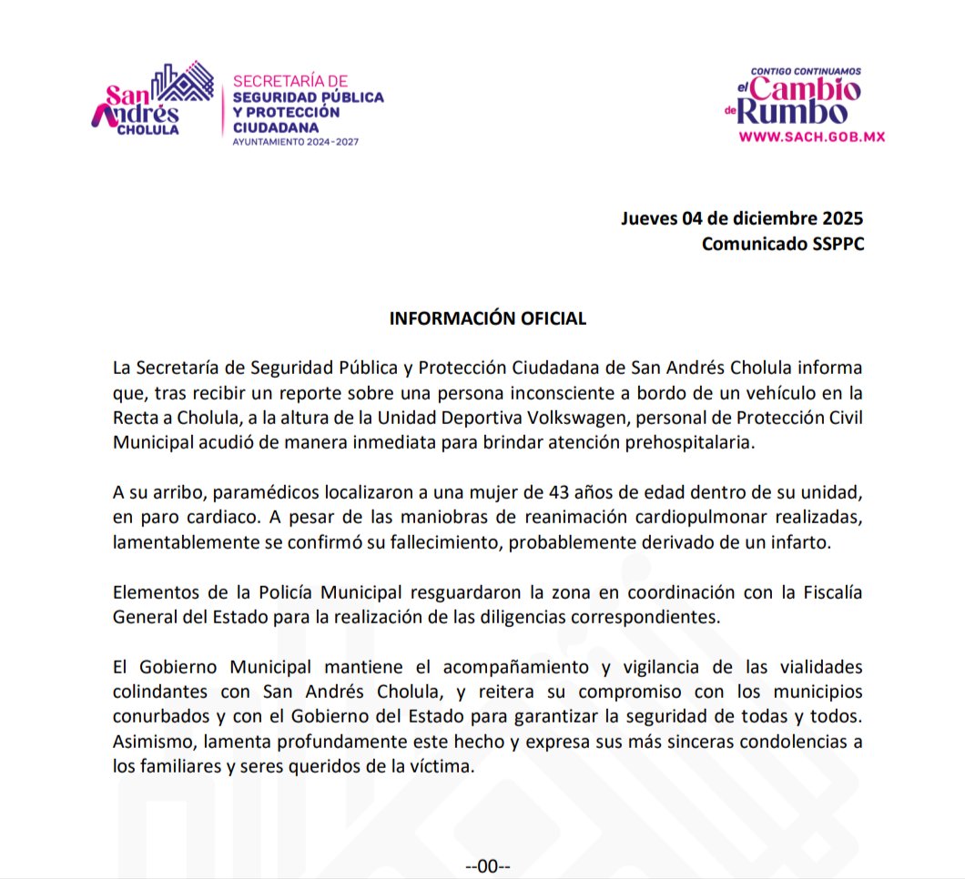 Elementos de la Policía Municipal de San Andrés Cholula arribaron al sitio y aseguraron el área para permitir el trabajo de los equipos de emergencia. La zona permanece acordonada mientras se llevan a cabo las diligencias correspondientes por parte de las autoridades.