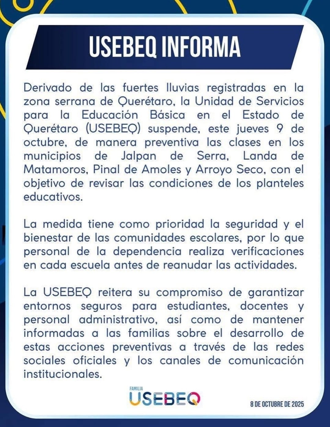 Derivado de las fuertes lluvias registradas en la zona serrana de Querétaro, la Unidad de Servicios para la Educación Básica en el Estado de Querétaro (USEBEQ) suspende, este jueves 9 de octubre, de manera preventiva las clases en los municipios de Jalpan de Serra, Landa de Matamoros, Pinal de Amoles y Arroyo Seco, con el objetivo de revisar las condiciones de los planteles educativos.