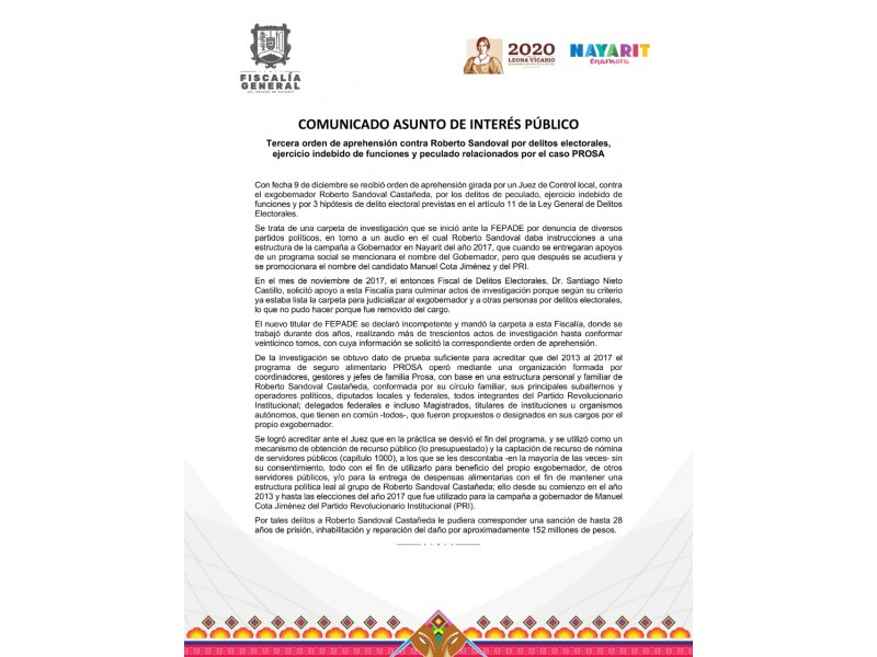 La Fiscalía General de Nayarit dio a conocer que fue girada una tercera orden de aprehensión contra Roberto Sandoval, ahora por presuntos delitos electorales, ejercicio indebido de funciones y peculado, todos relacionados por el manejo del programa social PROSA, que operó durante su sexenio.