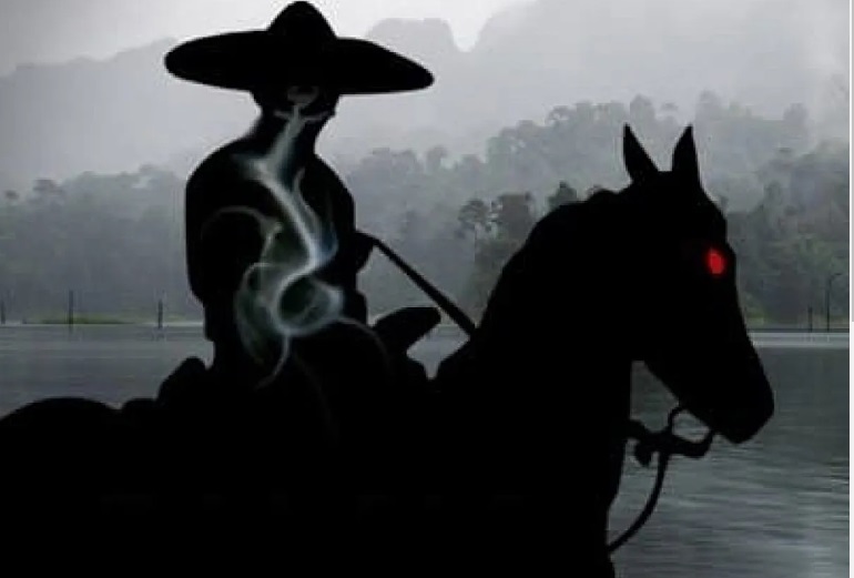 Se cuenta que, al caer el sol, aparece un ente masculino vestido con un traje de charro negro con detalles de oro y plata, montado sobre un caballo cuyos ojos brillan como bolas de fuego.