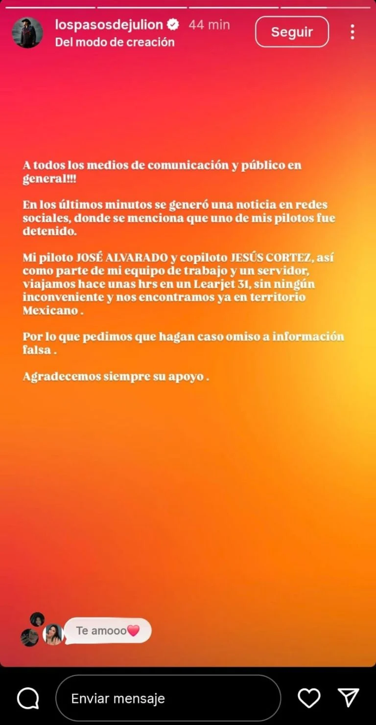 Horas después de que se difundiera esta noticia, ?Julión Álvarez negó sobre la detención de su piloto privado en Honduras después de la información publicada por las autoridades de ese país.