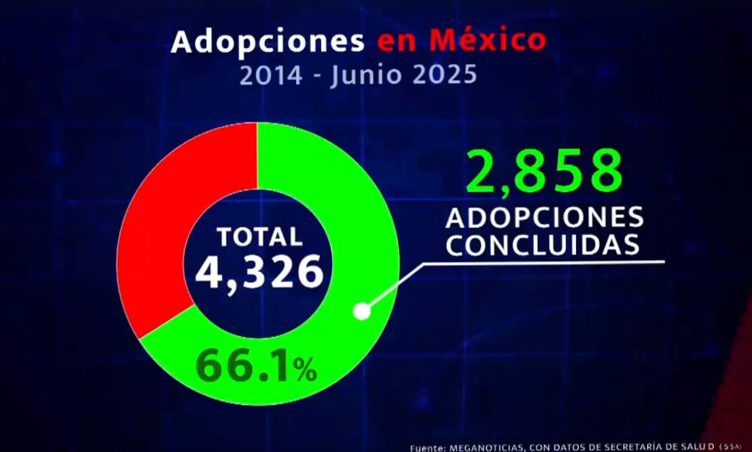 De acuerdo con el registro de adopciones de la Secretaría de Salud, de 2014 a junio de 2025, había 4 mil 326 menores de entre 0 y 17 años registrados, periodo en el que se logró concluir 2 mil 858 adopciones, un 66.1 por ciento de los casos.