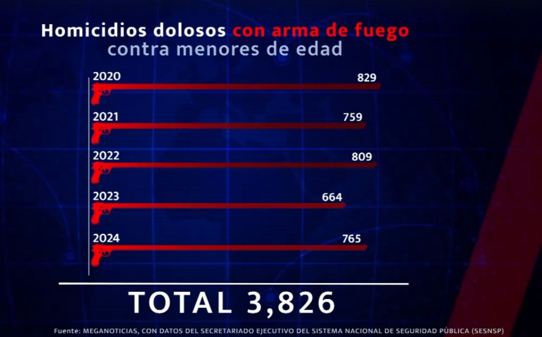 Como víctimas, de 2020 a 2024, los homicidios dolosos con arma de fuego en los que murieron menores de edad ascendieron a 3 mil 826 casos...
