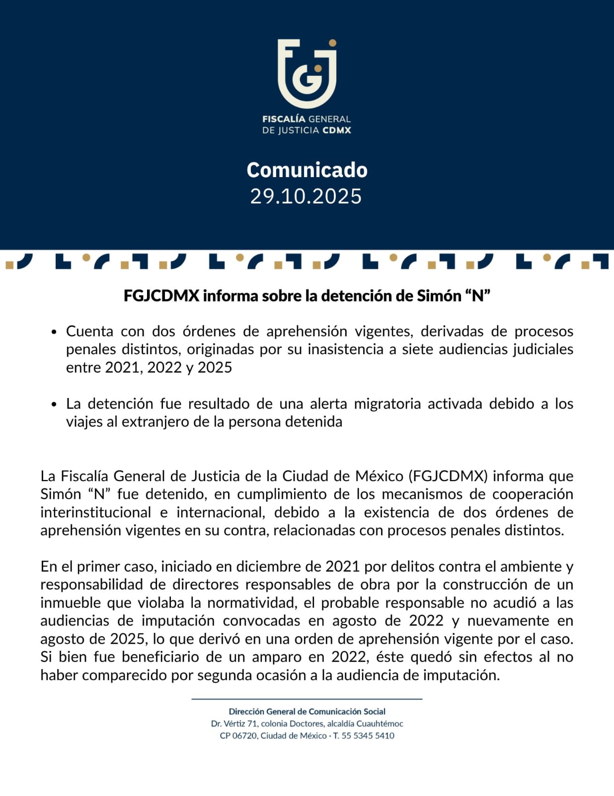 La Fiscalía capitalina confirmó la noticia mediante un comunicado y aseguró que la detención fue resultado de una alerta migratoria activada debido a sus viajes al extranjero.
