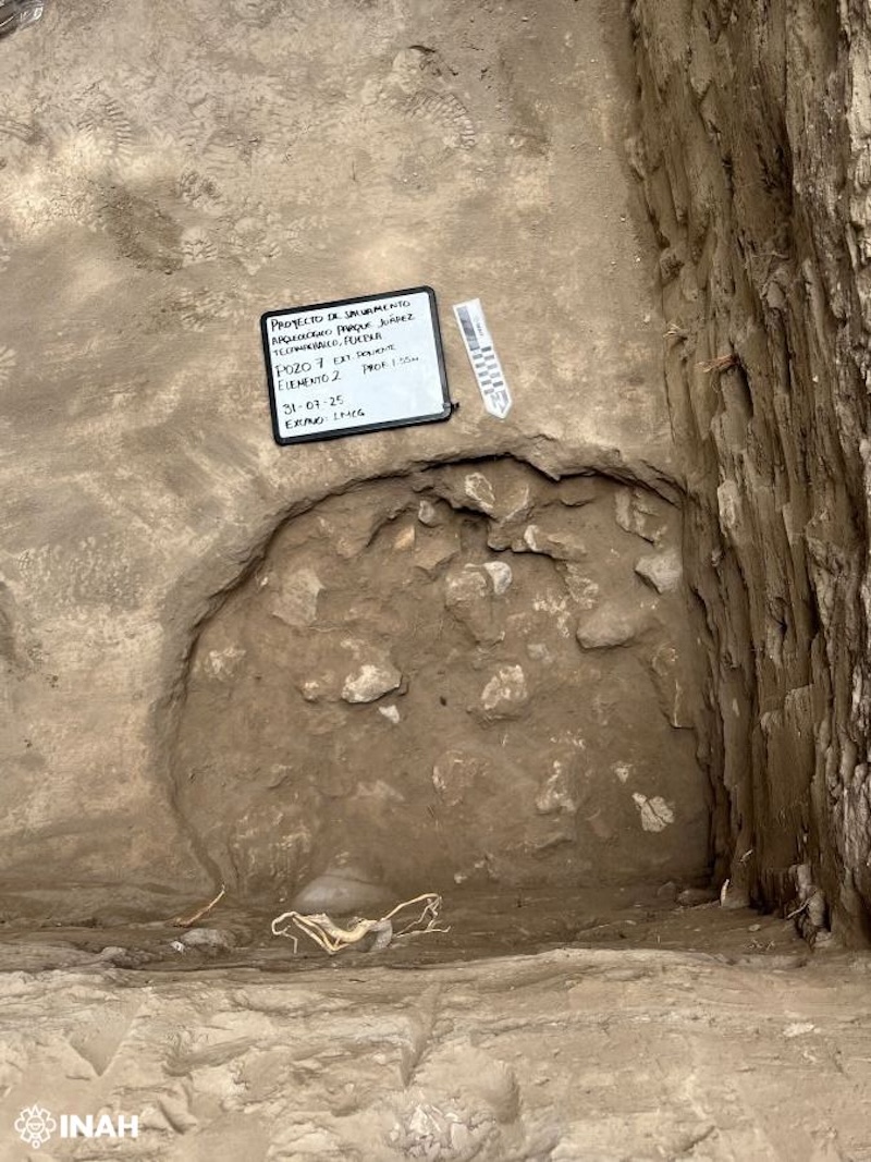 En el ala sur del parque, cerca de la estatua de Sor Juana Inés de la Cruz, se descubrieron dos fosas circulares rellenadas con ceniza, fragmentos de metate, cerámica, figurillas, navajillas de obsidiana y sonajas estucadas.