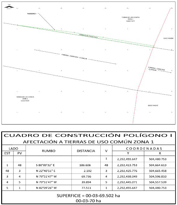 Tras una revisión técnica, se determinó que la superficie real a expropiar asciende a 370 m² de uso común, destinadas a obras del Tramo 4 "Izamal-Cancún".