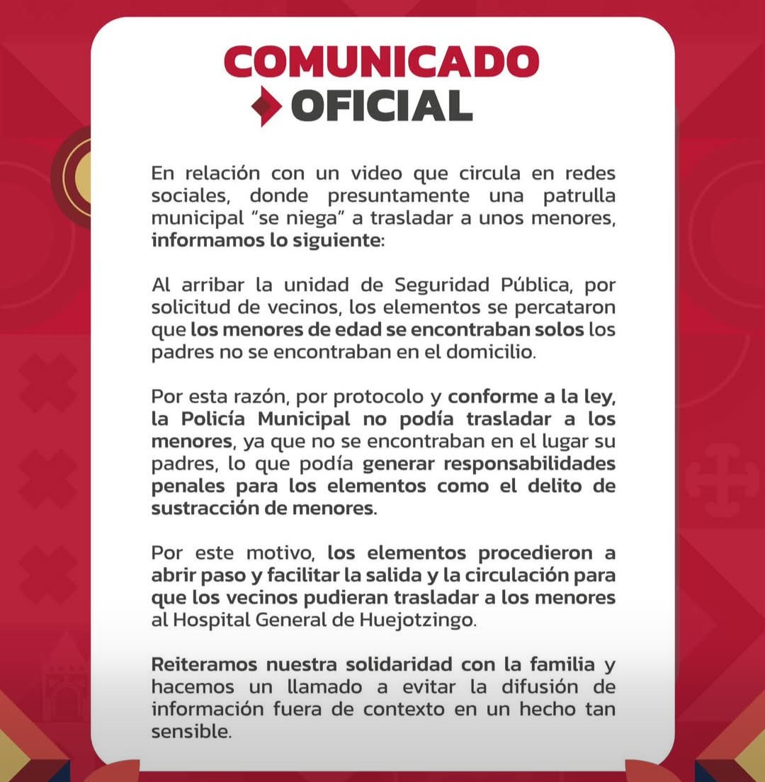 En un comunicado, el ayuntamiento justificó la actuación de los elementos, argumentando que el traslado directo podría violar protocolos institucionales y constituir posibles delitos. Señalaron que su intervención se limitó a brindar paso al vehículo particular que llevó a los menores.