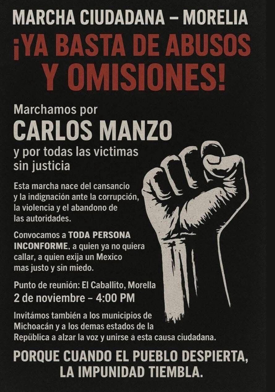 A través de redes sociales ciudadanos convocaron a marchar para exigir justicia por la muerte del presidente municipal de Uruapan,Carlos Manzo Rodríguez, quien fue asesinato la noche del sábado en el centro de la ciudad,