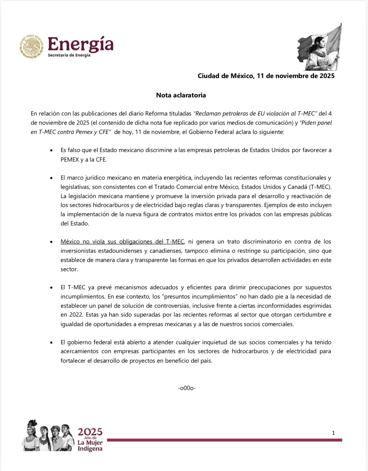 "Informamos que es falso que el Estado mexicano discrimine a las empresas petroleras de Estados Unidos por favorecer a Pemex y a la CFE".