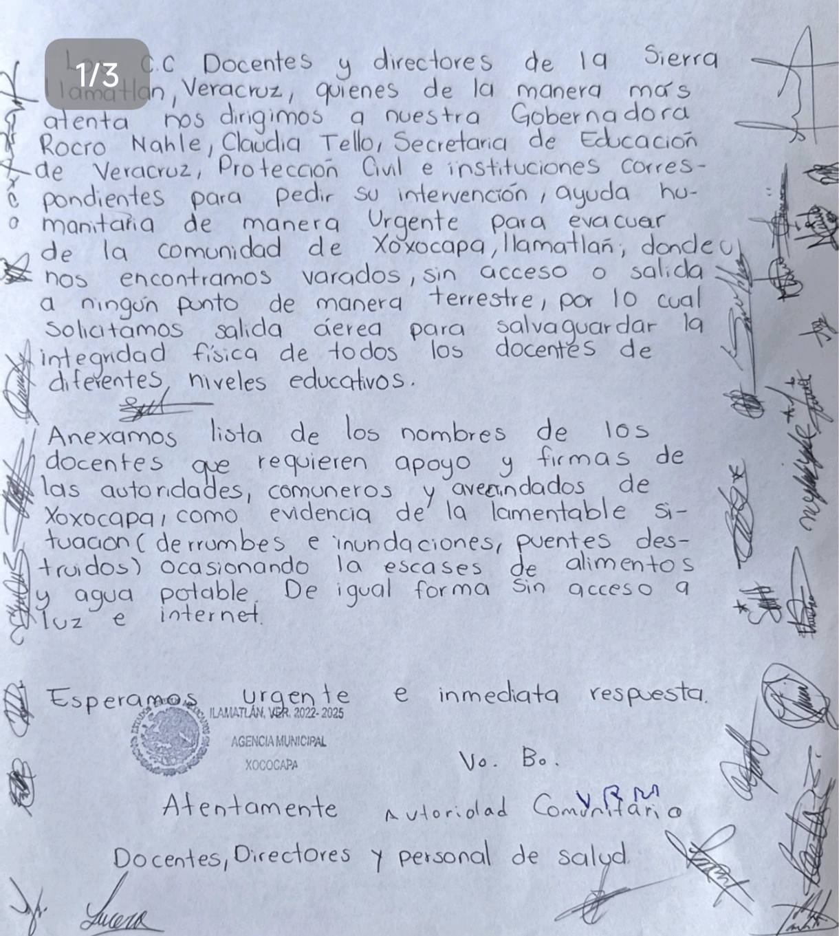 En dicha carta, los docentes de diversos niveles educativos reportan que dos maestras y una menor de edad fallecieron en las últimas horas, por lo que solicitan ayuda urgente a la Gobernadora y a la Secretaría de Educación para su rescate vía área toda vez que no hay comunicación terrestre hacia Hidalgo que es la ruta más viable y cercana,