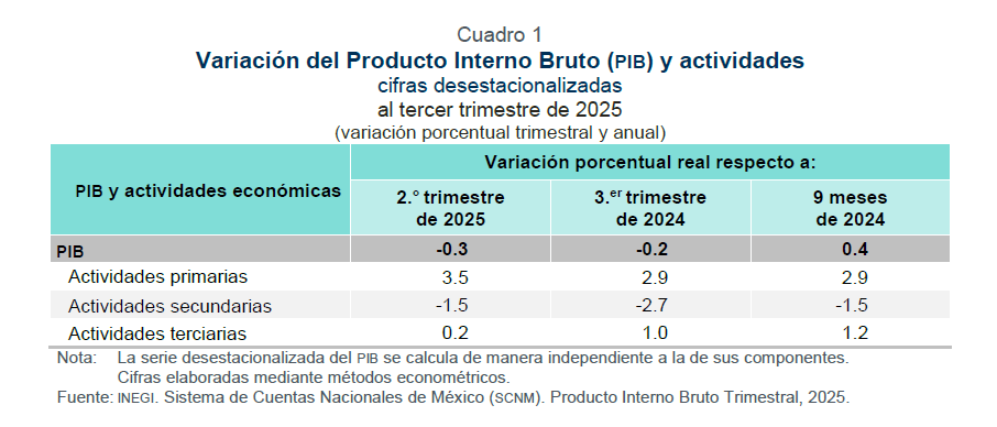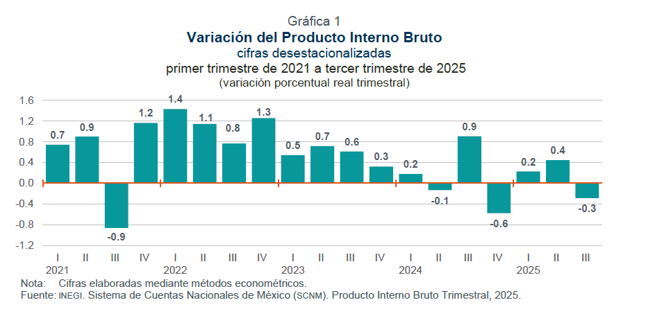 Entre julio y septiembre de 2025 el PIB registró una caída trimestral de 0.3%, y una baja anual de 0.2%.