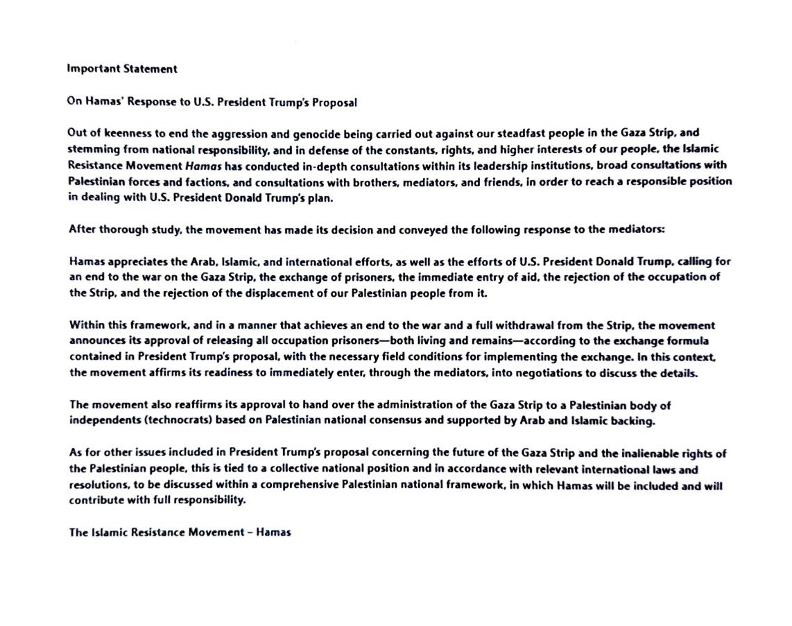 Tras un análisis detallado, el movimiento informó que aprueba la liberación de todos los prisioneros en poder de Israel, tanto vivos como los restos de fallecidos, siguiendo la fórmula de intercambio contemplada en la propuesta de Trump, siempre que se den las condiciones necesarias sobre el terreno para implementar el acuerdo.