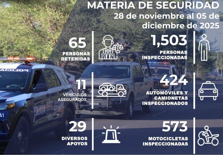 Durante la semana del 28 de noviembre al 5 de diciembre, la Policía Estatal Preventiva (PEP), en coordinación con personal operativo de la Secretaría de Marina Armada de México (SEMAR), lograron la detención de 65 personas por delitos relacionados con la violación a la Ley Federal de Armas de Fuego y Explosivos, delitos contra la salud, violencia familiar, robo equiparado, lesiones y diversas faltas administrativas