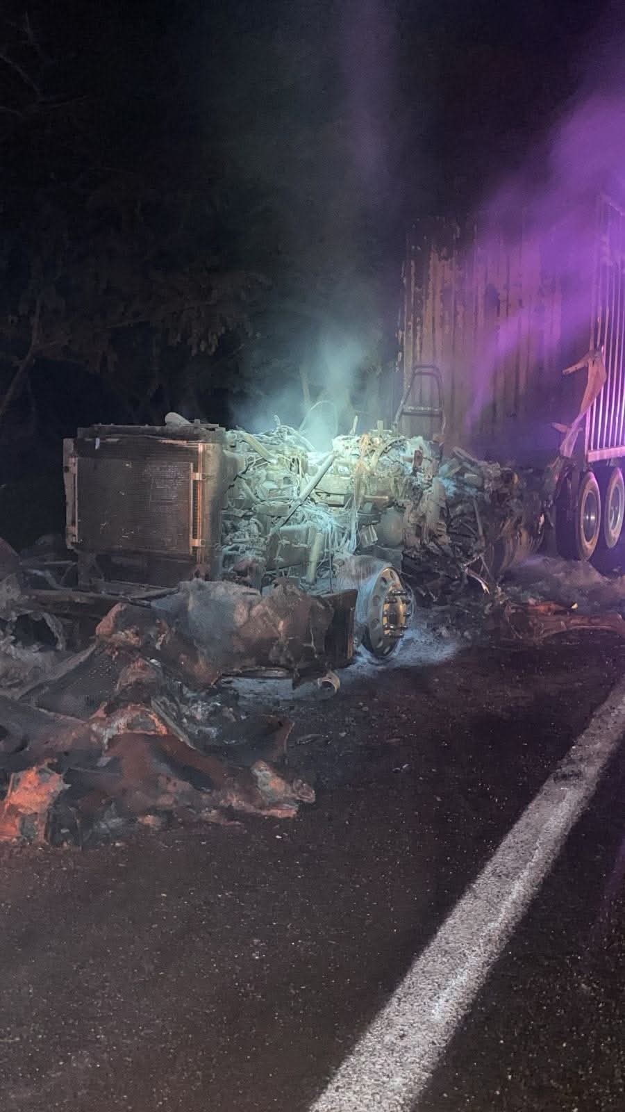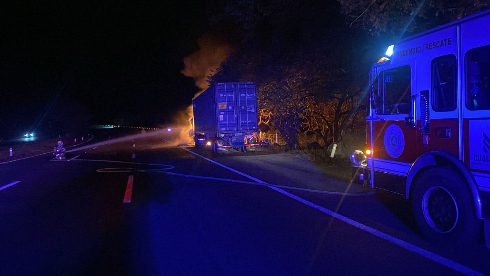 La madrugada de este miércoles, un tráiler fue consumido por el fuego sobre el kilómetro 136+500 de la autopista Colima?Guadalajara, a la altura de la caseta fitosanitaria.
