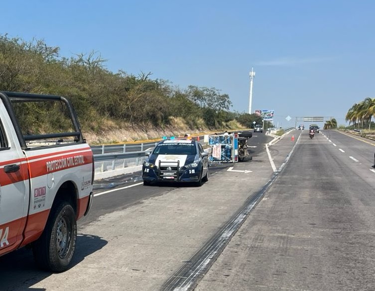 La tarde de este viernes se registró la volcadura de una camioneta de transporte de garrafones con agua sobre el libramiento Ejército Mexicano, antes de llegar al puente sobre el bulevar Miguel de la Madrid Béjar, informó la Unidad Estatal de Protección Civil (UEPC).