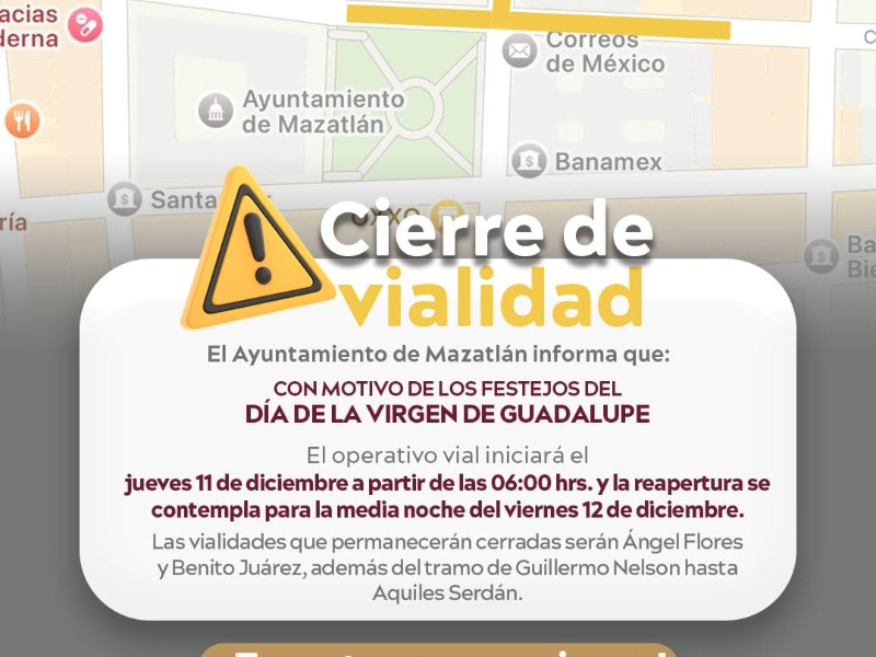 Cierre vial por festejos a la Virgen de Guadalupe en Mazatlán