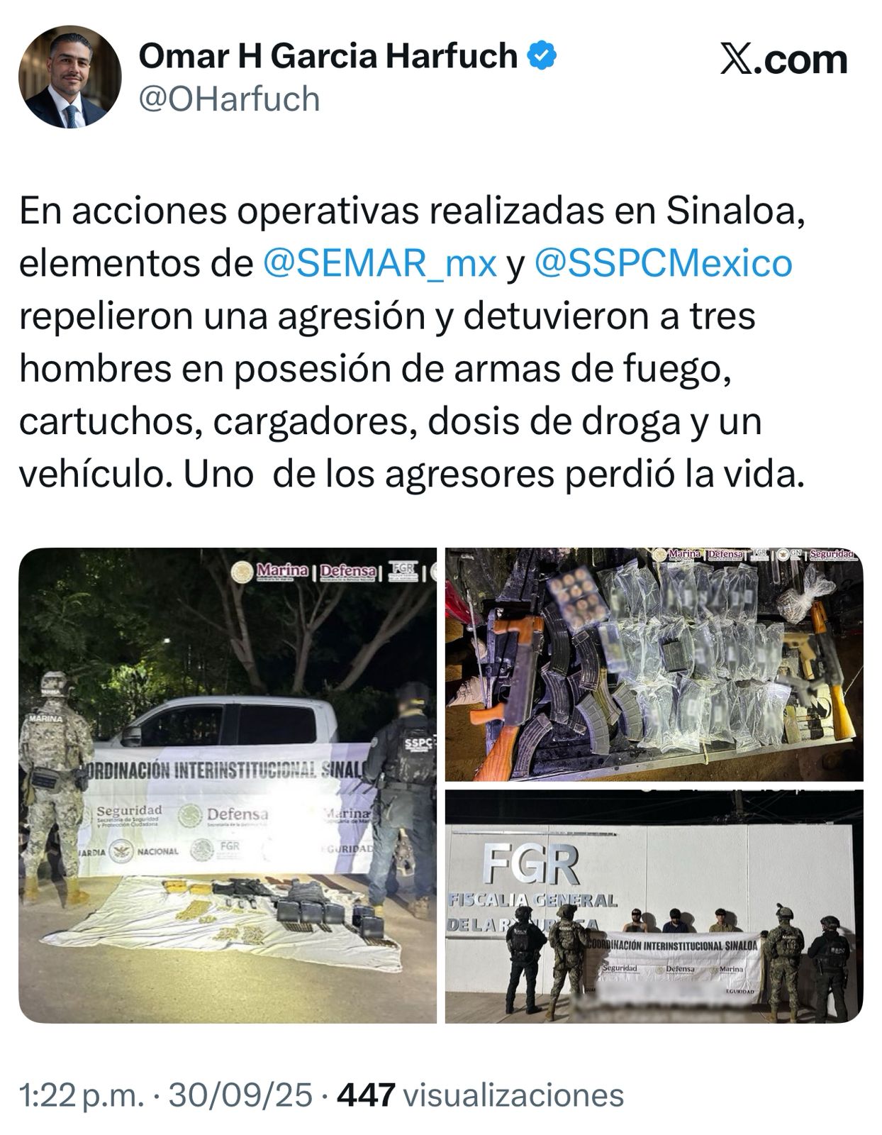 "En acciones operativas realizadas en Sinaloa, elementos de @SEMAR_mx y @SSPCMexico repelieron una agresión y detuvieron a tres hombres en posesión de armas de fuego, cartuchos, cargadores, dosis de droga y un vehículo. Uno de los agresores perdió la vida".