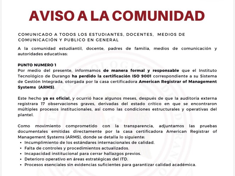 ITD en punto crítico: estudiantes denuncian pérdida de certificación ISO