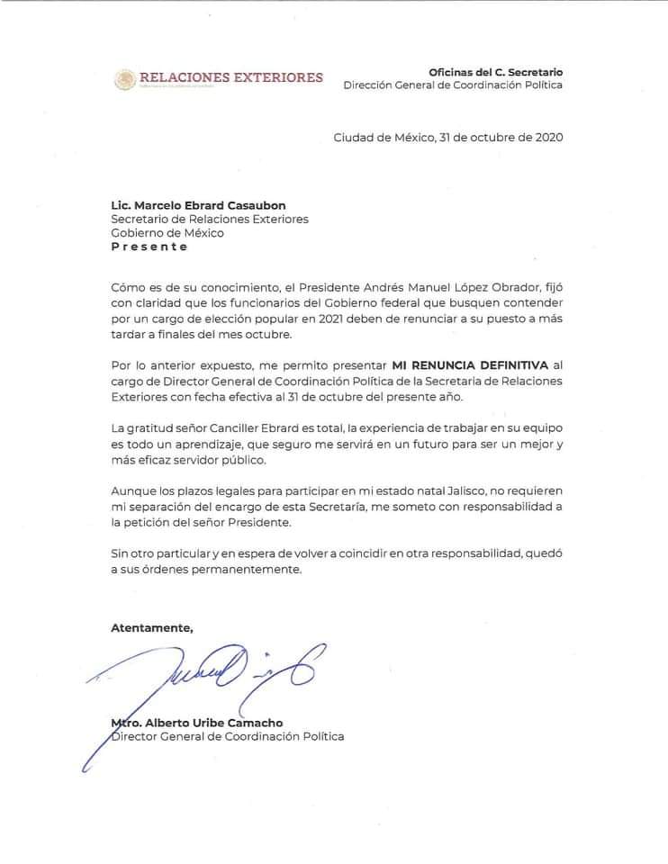 El ex presidente municipal de Tlajomulco, Alberto Uribe, renunció a la Dirección General de Coordinación Política de la Secretaría de Relaciones exteriores el pasado 31 de octubre para buscar un cargo en Jalisco, durante las próximas elecciones.