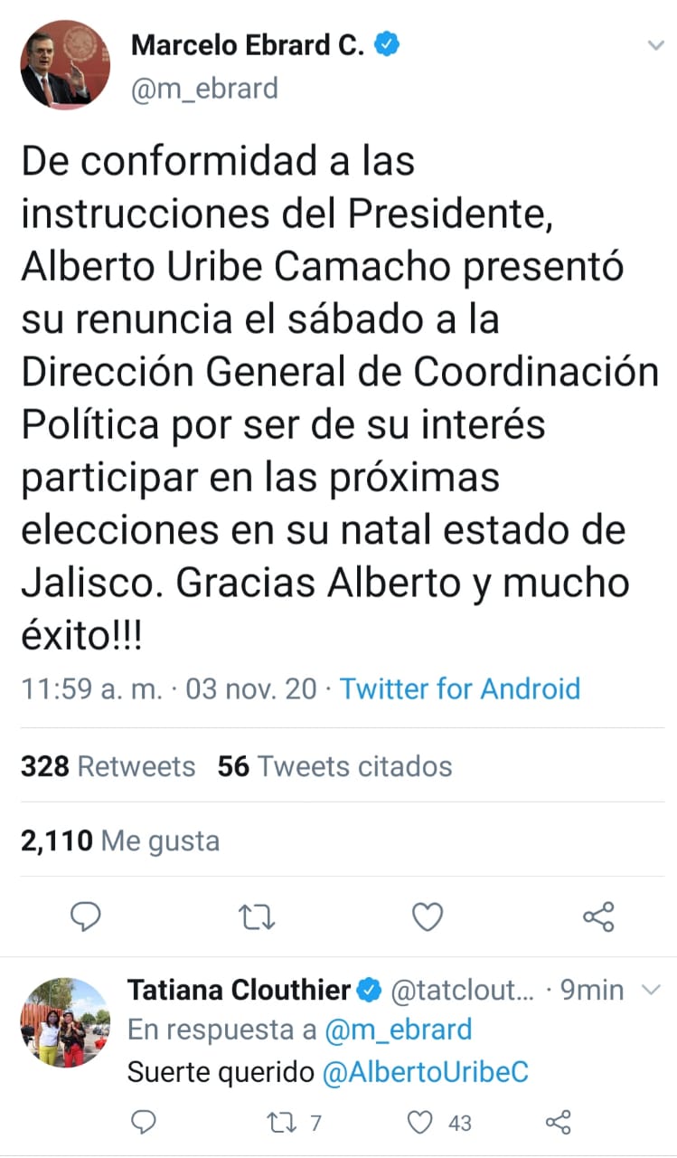 Por su parte, el canciller mexicano, Marcelo Ebrard aceptó la renuncia y le deseó suerte a Uribe quien ahora buscará un nuevo cargo por MORENA.
