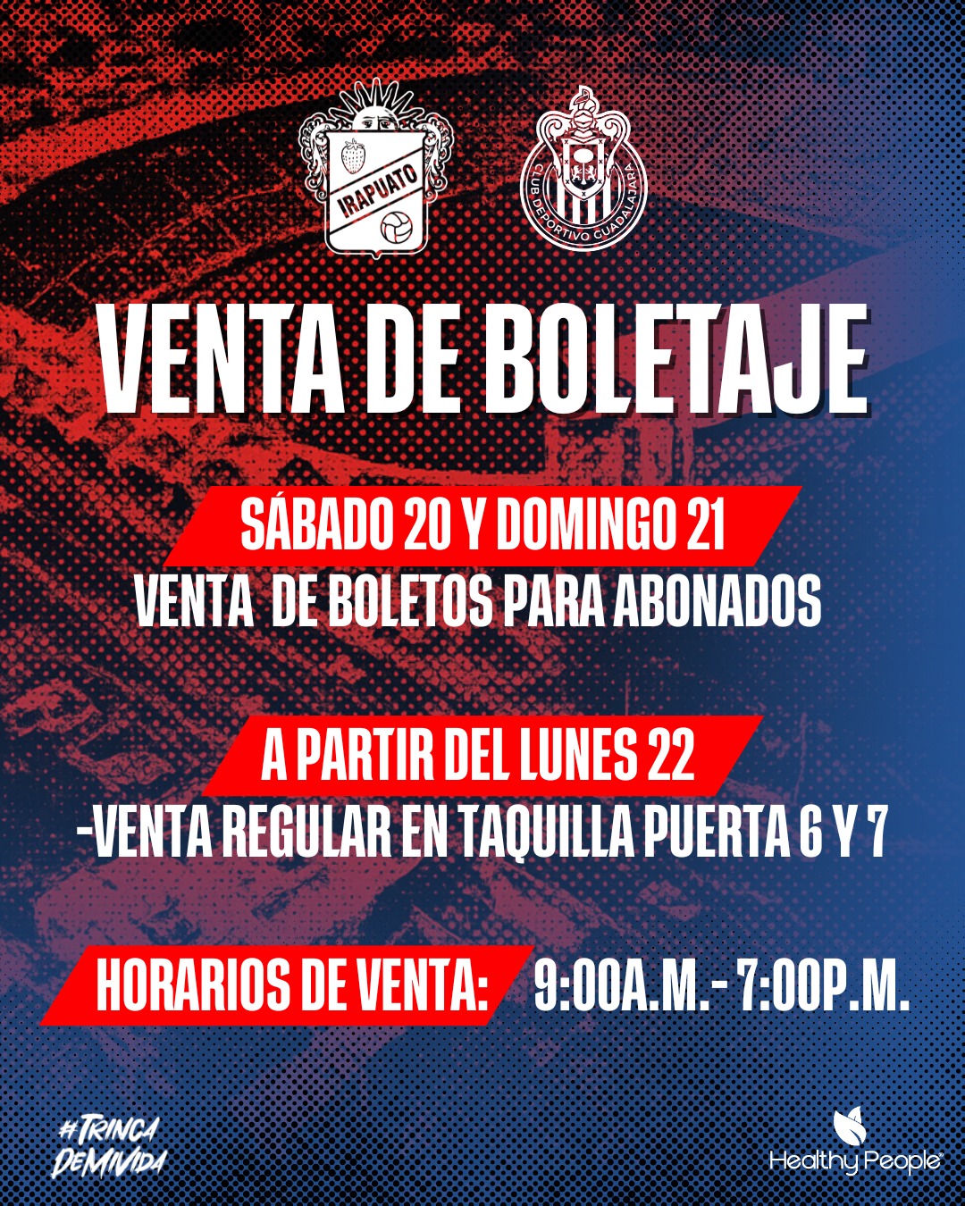 En cuanto a la venta de boletos, los días 20 y 21 de diciembre estarán destinados exclusivamente para los abonados del Club Irapuato, mientras que la venta general se realizará el día 22, en un horario de 9:00 de la mañana a 7:00 de la noche, directamente en las taquillas del estadio.