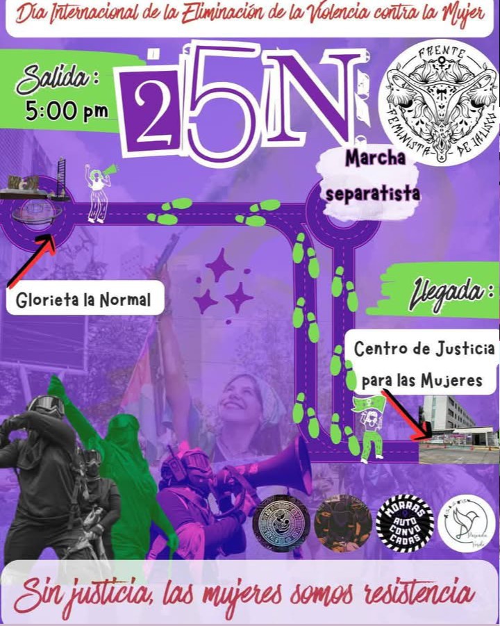 El Frente Feminista de Jalisco lanzó una convocatoria para esta movilización que se realizará mañana 25 de noviembre en el marco del Día Internacional de la Eliminación de la Violencia contra la Mujer, la movilización se efectuará bajo la consigna: "Sin justicia, las mujeres somos resistencia".