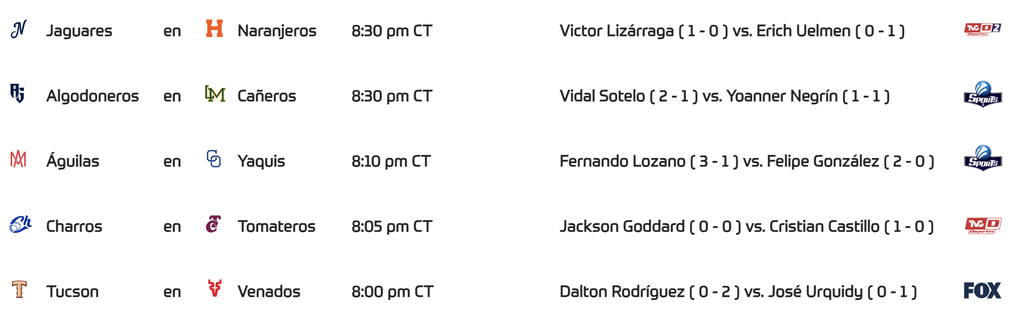 En otro frente, las Águilas de Mexicali viajan a Ciudad Obregón para medirse ante los líderes Yaquis. El abridor Fernando Loza buscará su cuarta victoria de la campaña por los cachanillas, mientras que los sonorenses enviarán al invicto Felipe González, quien presume marca de 2-0.