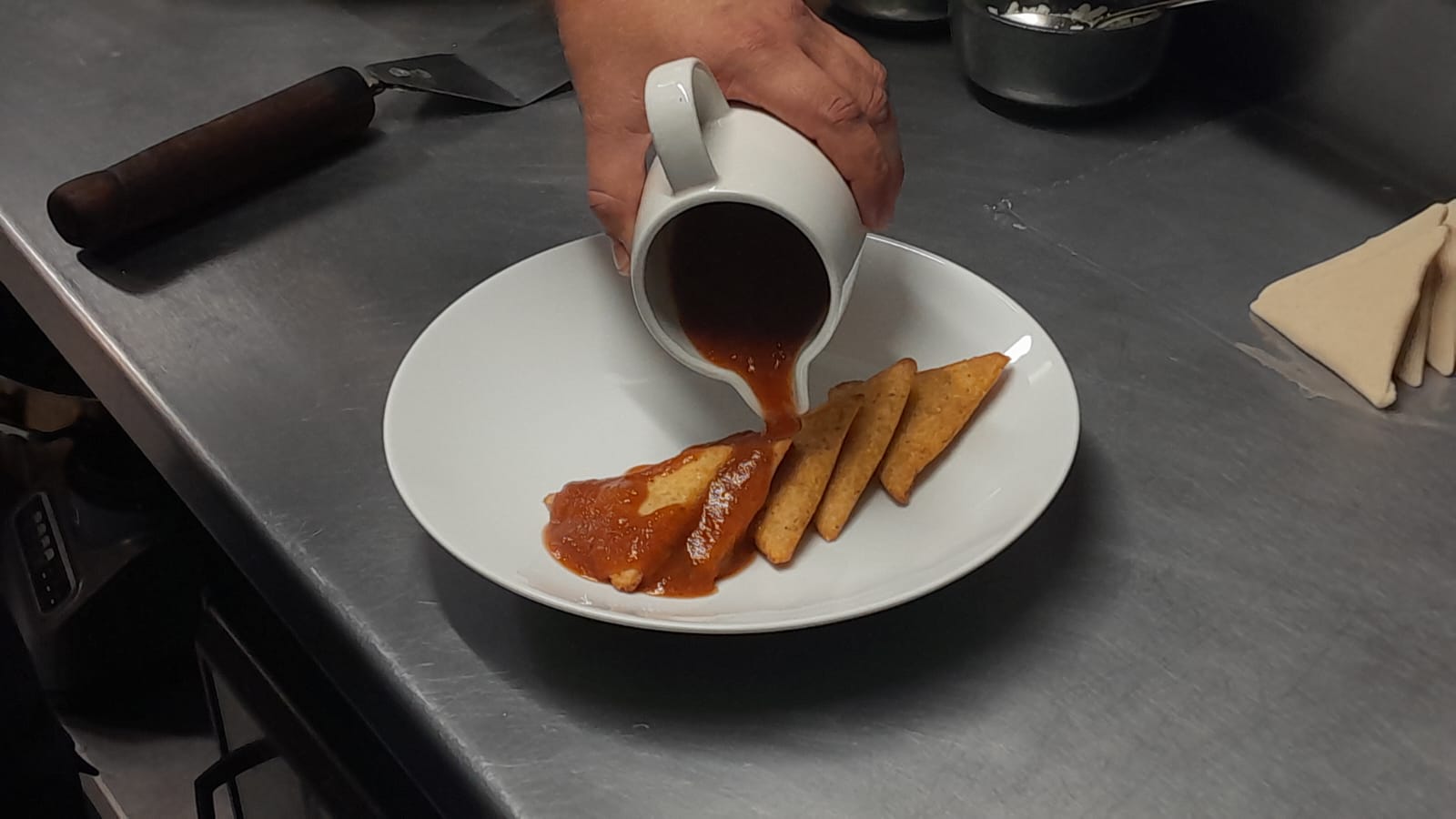 "Es algo que llegó para darnos una identidad a nosotros y estamos orgullosos de servir este platillo, son unos chilaquiles que creamos con maíz y están rellenos de dos quesos regionales, sonorenses muy buenos, es el queso oreado y también el queso de ures los fundimos en una mezcla y balance perfecto que logramos nosotros y las salsas que tenemos son una salsa verde tatemada y una salsa roja también con nuestro toque único de aquí de manera, ponemos una sala verde, roja o combinada" señaló el chef del restaurante, Emanuel Ávila.
