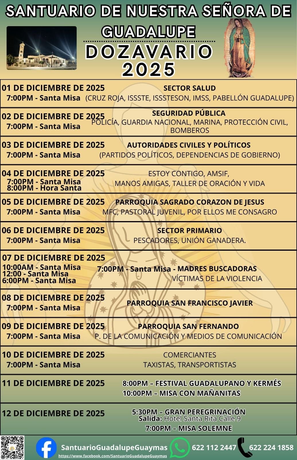 El Santuario de Nuestra Señora de Guadalupe dio a conocer el programa oficial del Dozavario 2025, que se llevará a cabo del 1 al 12 de diciembre, con celebraciones dedicadas a distintos sectores de la comunidad y actividades religiosas tradicionales.