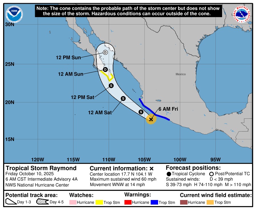A su vez, un se mantiene en vigilancia la tormenta tropical "Raymond". Dicho sistema mantiene una tendencia de trayectoria hacia el noroeste del país, por lo que mantiene alta probabilidad de ocasionar precipitaciones fuertes a muy fuertes durante el próximo fin de semana en todo el estado de Sonora. Aunado a esto, generará un aumento en la velocidad de los vientos con rachas de 70 a 90 km/h sobre la línea costera sur, así como oleaje de 3 a 5 metros en municipios costeros y comunidades pesqueras.
