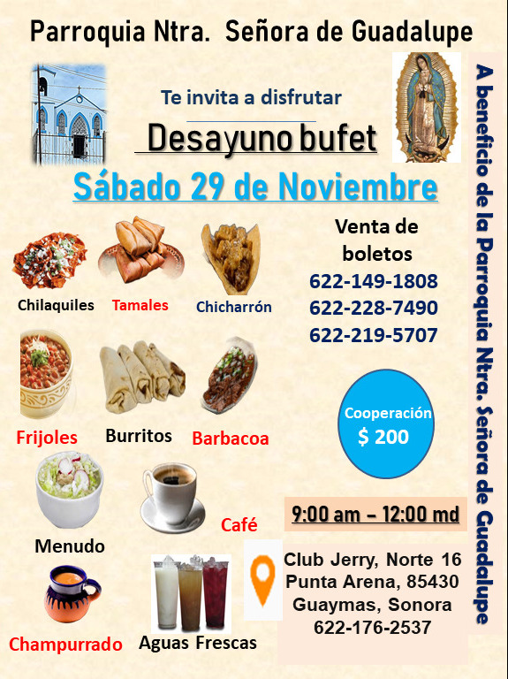 La Parroquia Nuestra Señora de Guadalupe realizará un desayuno bufet con causa el próximo sábado 29 de noviembre, con el objetivo de recaudar fondos para las actividades de la comunidad religiosa.