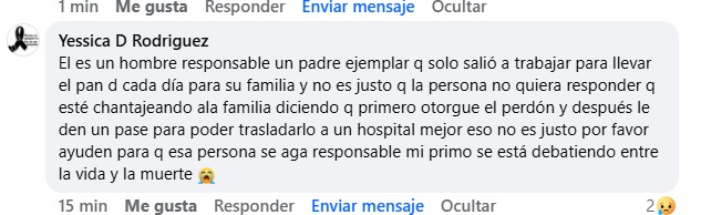 Sus familiares han denunciado la falta de atención y humanidad por parte del responsable quien pide que le otorguen el perdón para después acceder a pagar los gastos médicos. "pedimos justicia, mi hermano se debate entre la vida y la muerte" señala Yesenia hermana de Daniel.