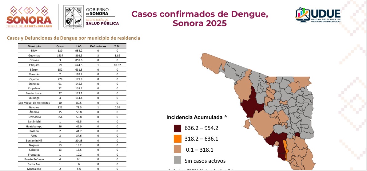 Sonora registra 3,028 casos y una incidencia de 91.15 por 100 mil habitantes. Casos confirmados de Dengue por entidad. El 58% de los casos confirmados del país lo concentra Sonora 3,028, Veracruz 2,623, Jalisco 2,205, Sinaloa 1,606 y Guanajuato 1,423.