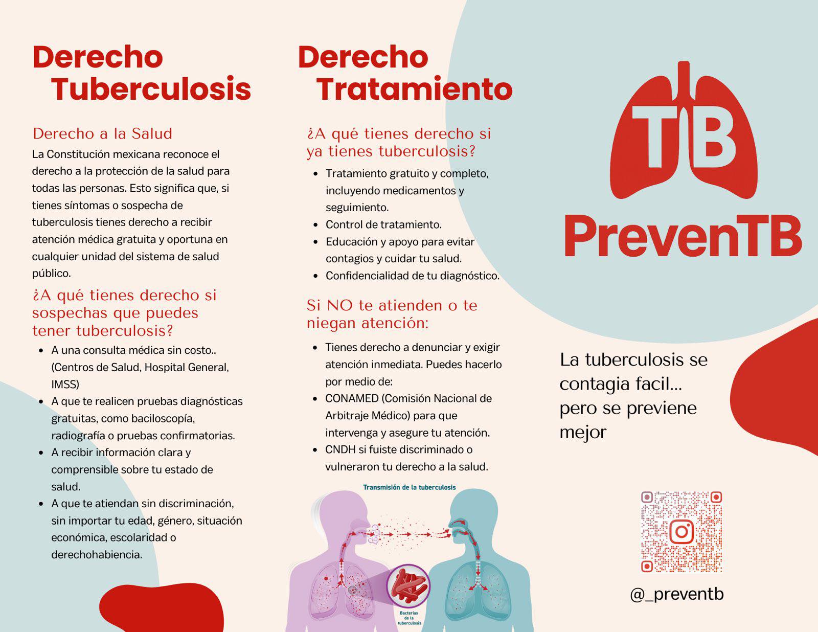 A través de trípticos informa a la comunidad sus derechos como el de obtener una cita médica cuando se necesite, sin costo y en centros de salud e IMSS; a realzarse pruebas diagnósticas gratuitas como baciloscopia, radiografía o pruebas confirmatorias; recibir información clara y comprensible de su estado de salud; a ser atendido sin discriminación sin importar edad, género, situación económica, escolaridad o derechohabiencia.