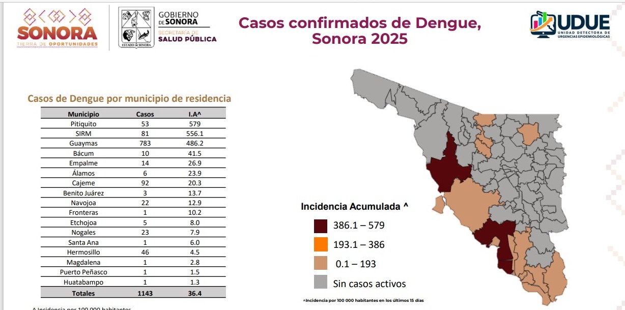 Vamos a las cifras en cuanto a casos de dengue en la región de dengue en Sonora, en esta semana #41 que corresponde del 11 al 15 de octubre en Guaymas hay un acumulado de 783 casos y en Empalme el registro es de 14 según los datos de la Secretaría de Salud en Sonora.