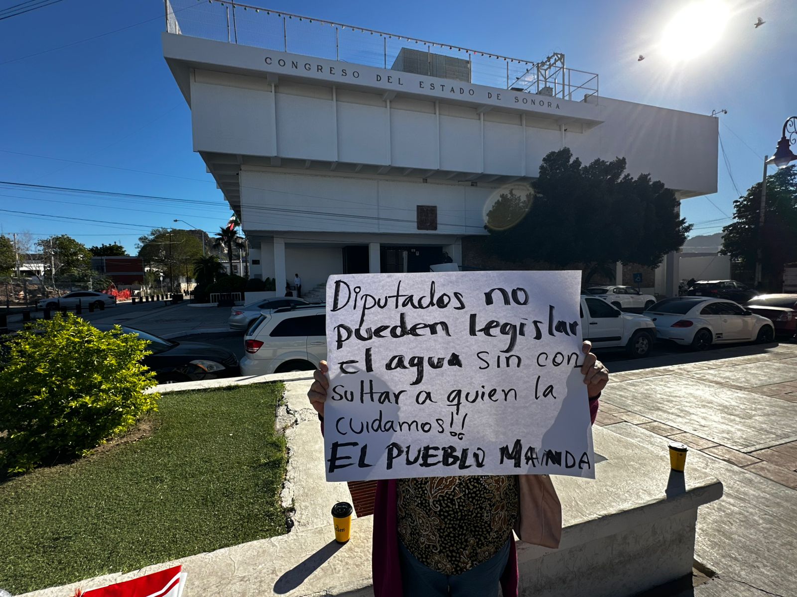 Integrantes del Movimiento en Defensa del Agua y el Territorio Sonora, junto a Pueblos del Río Sonora y Río San Miguel, realizaron una manifestación frente al Congreso del Estado para rechazar el intento de convertir el Plan Hídrico en una ley transexenal.
