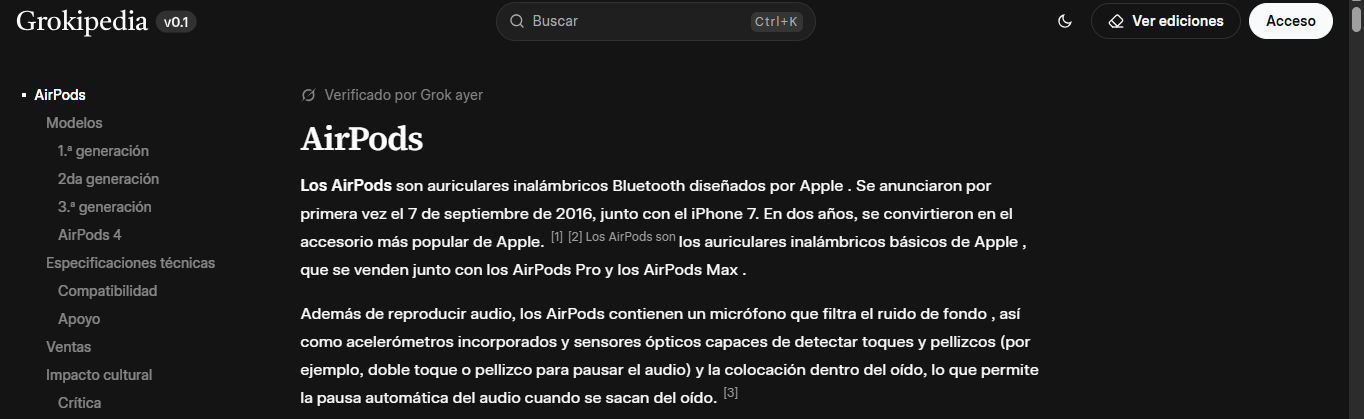 Grokipedia se encuentra en su versión preliminar v0.1 y cuenta con más de 885 mil artículos, frente a los aproximadamente 7 millones de páginas en inglés que mantiene Wikipedia.