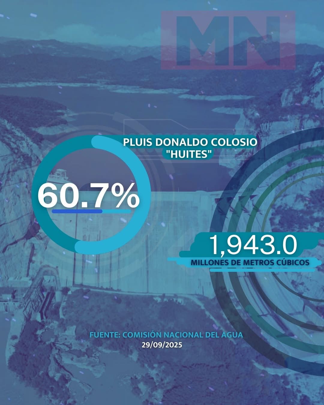 La presa Luis Donaldo Colosio, conocida como "Huites", registra un 60.7% de su capacidad, con 1,943 millones de metros cúbicos almacenados.