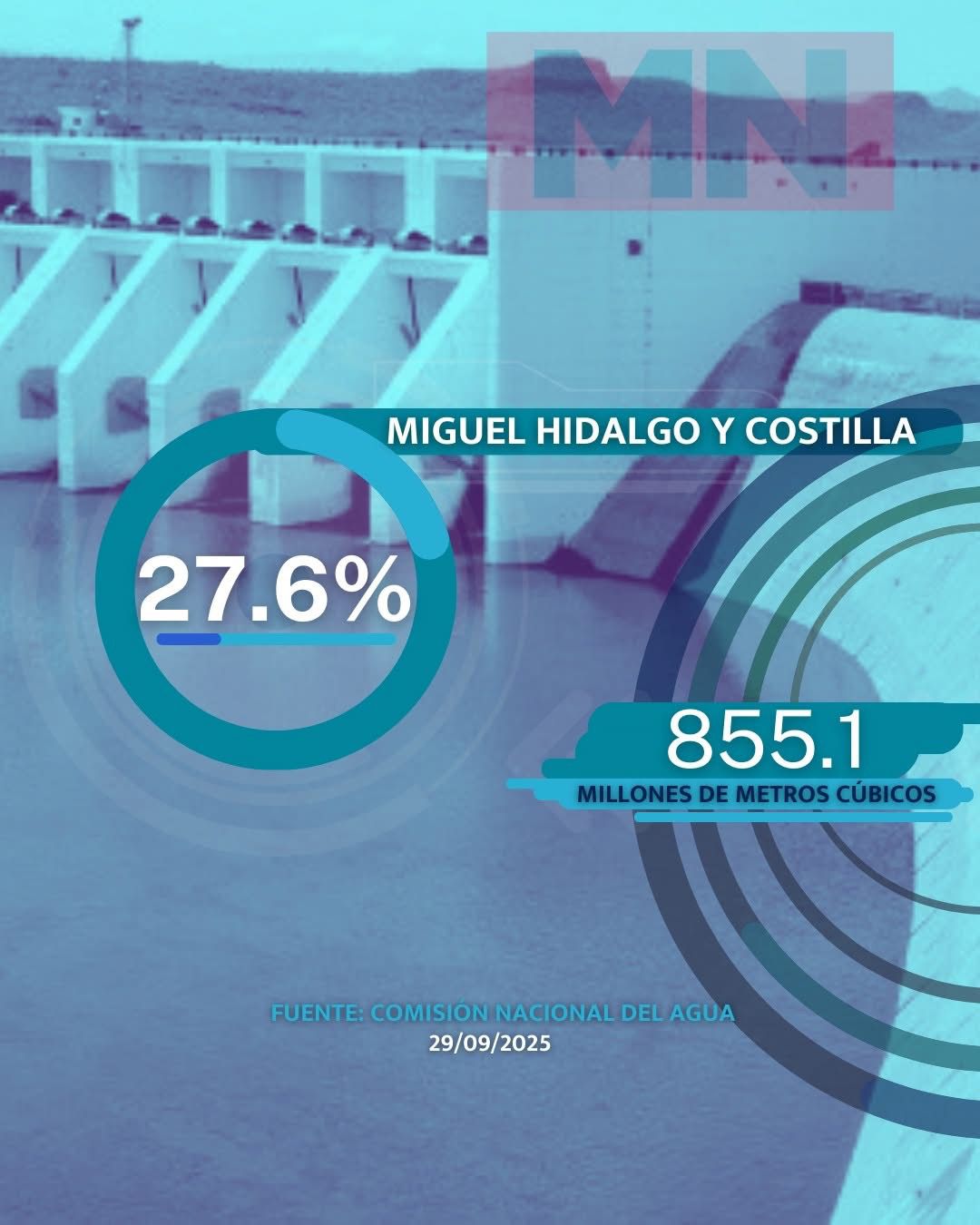 Por su parte, la presa Miguel Hidalgo y Costilla amaneció al 27.6 % de su capacidad de conservación con 855.1 millones de metros cúbicos.