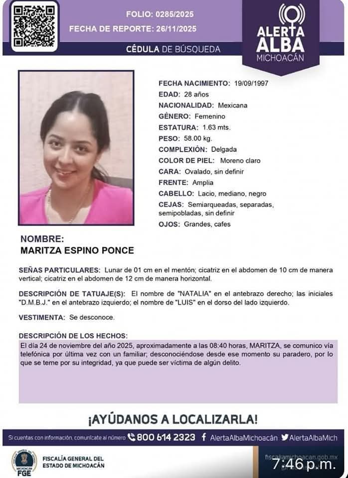 Maritza contaba con una alerta alba por su desaparición desde el pasado 24 de noviembre, desgraciadamente fue localizada sin vida. Actualmente hay señalamientos por la familia de que sus hijas se encuentran en peligro por un supuesto secuestro. La Fiscalía analiza el caso para encontrar al feminicida de Maritza y descartar peligro para sus hijas.