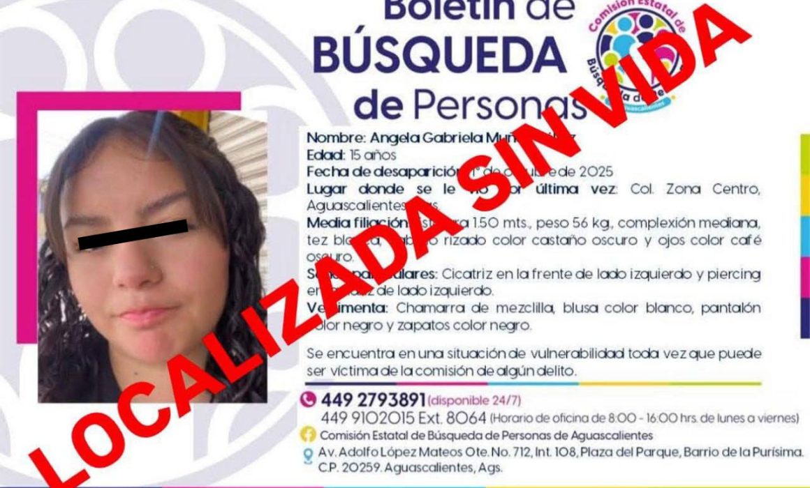 La Fiscalía General del Estado de Querétaro (FGEQ) confirmó el hallazgo sin vida de Ángela Gabriela Muñoz Téllez, una joven de 15 años reportada como desaparecida en Aguascalientes desde el 1 de octubre. Su cuerpo fue localizado en la comunidad de Fuentezuelas, municipio de Tequisquiapan, como resultado de una investigación conjunta entre las fiscalías de ambos estados.