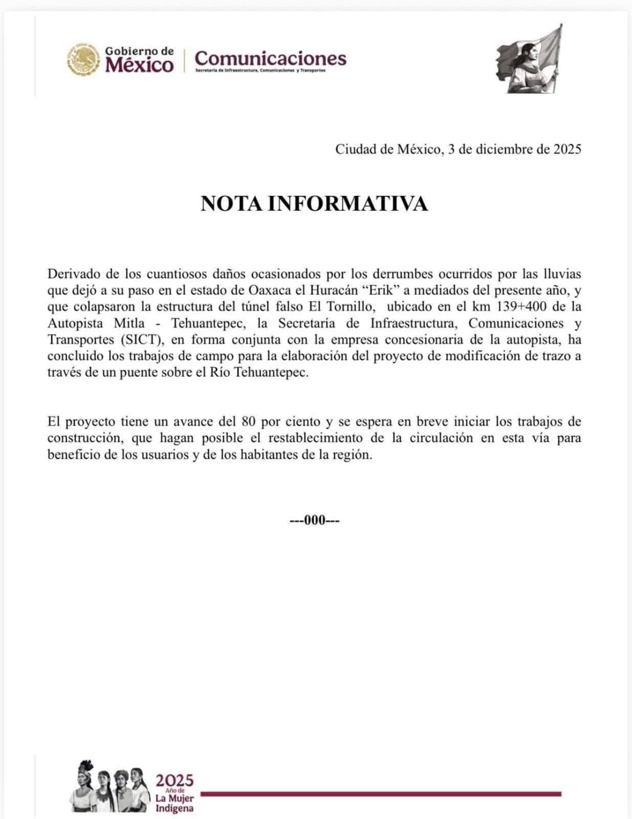 "Derivado de los cuantiosos daños ocasionados por los derrumbes ocurridos por las lluvias que dejó a su paso en el estado de Oaxaca el Huracán "Erik" a mediados del presente año, y que colapsaron la estructura del túnel falso El Tornillo, ubicado en el km 139+400 de la Autopista Mitla Tehuantepec, la Secretaría de Infraestructura, Comunicaciones y Transportes (SICT), en forma conjunta con la empresa concesionaria de la autopista, ha concluido los trabajos de campo para la elaboración del proyecto de modificación de trazo a través de un puente sobre el Río Tehuantepec", expresó la Secretaría en un comunicado oficial.