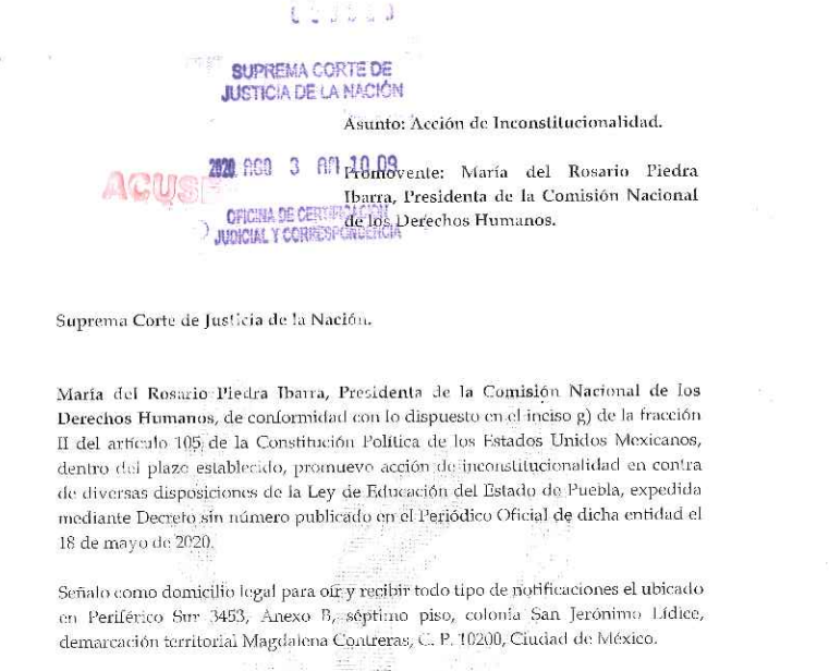 La Comisión Nacional de los Derechos Humanos (CNDH) promovió una acción de inconstitucionalidad ante la Suprema Corte de Justicia de la Nacional (SCJN) por la violación a la ley y a los derechos de comunidades indígenas y personas con discapacidad al no consultarles la Ley de Educación aprobada en Puebla en unos meses.