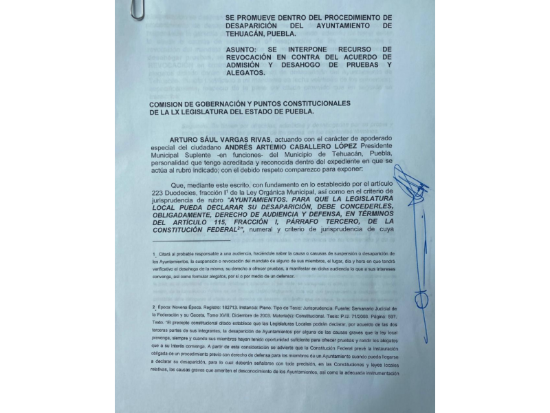 El documento fue entregado por su apoderado especial, Arturo Saúl Vargas Rivas, quien abrió su defensa con base en el Artículo 223 de la Ley Orgánica Municipal para obligar a la concesión de audiencia al presidente en funciones de Tehuacán y solicita a la comisión en el Congreso respetar los derechos de Caballero López.