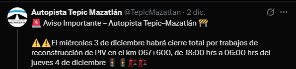 De acuerdo con los avisos emitidos por la administración de la autopista, el cierre obedeció a maniobras de demolición de losa en un paso inferior vehicular (PIV), específicamente a la altura del kilómetro 67+600 de la vía de cuota Tepic?Mazatlán; debido al tipo de labores y al riesgo que implican, se determinó restringir por completo el paso vehicular mientras se realizaban los trabajos.